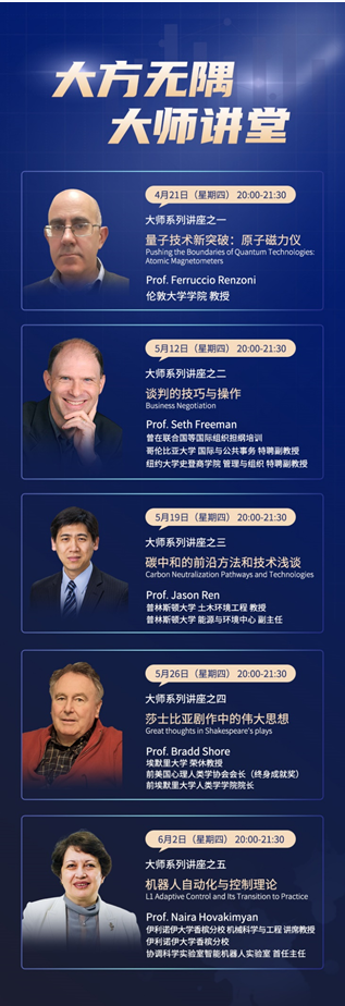 为开拓公司员工国际学术视野,增加与世界学术大师近距离接触的机会,满足员工学习多样性需求,提升多角度思考问题的能力,进一步加强学科交叉和跨学科人才培养,“让理工科的员工增加人文情怀,让人文社科的员工增强科学素养”,提高解决问题的学术能力,进行面向国际、面向未来、面向全人类的国际化思维训练。教务处在本学期将陆续推出《大方无隅·大师讲堂》系列大师讲座,来自全球一流高等学府和研究机构的专家教授将做客讲堂,与同学们分享科学人文前沿的研究方法、进展以及前沿交叉学科领域的新发展动向。