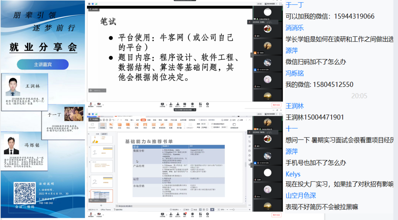 为帮助同学们了解当前的就业形势和政策,在春招中实现更高质量、更充分的就业,beats365于4月6日晚19:30举办了“朋辈引领,职点迷津”就业经验分享会。本次活动以线上会议的形式进行,为同学们发现就业机遇、交流求职经验搭建了良好的平台。