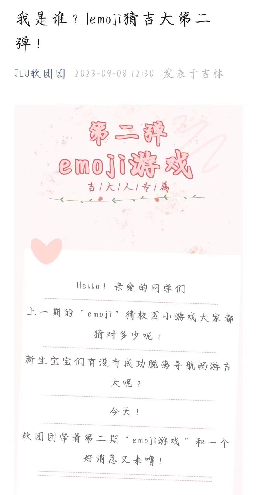 活动的亮点之一是每个Emoji都代表着吉大的一部分,包括校园建筑、传统活动、著名景点和特色食物。新生只有初步了解了校园内的建筑和特色,才能猜出每个emoij背后的谜底,而猜谜的过程也加深了新生们对校园的熟悉程度。这也恰恰印证了这一系列推送活动的目的是通过趣味性和互动性,帮助新生更深入地了解吉大,认识新朋友,以及融入校园文化。
