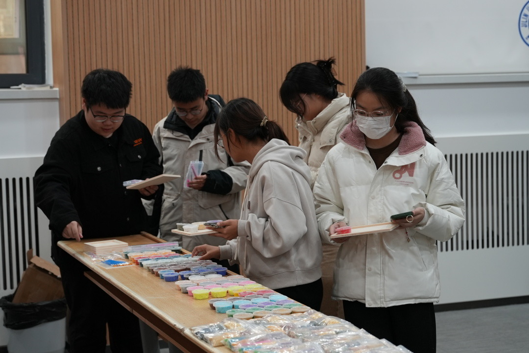 首先,文艺部成员通过PPT及实物进行示范讲解,详细介绍了粮食画的拼贴技法,通过将各种颜色的五谷粘在底板呈现不同的图案,表达的是对五谷丰登美好生活的希冀。纸浆画通过将废纸转化为纸浆,加入颜料和胶水在画板上塑形而成,成品具有粗糙质朴的质感与立体浮雕效果,常用于装饰或艺术表达,且其利用废旧纸张,有让旧物焕发新生的环保理念。