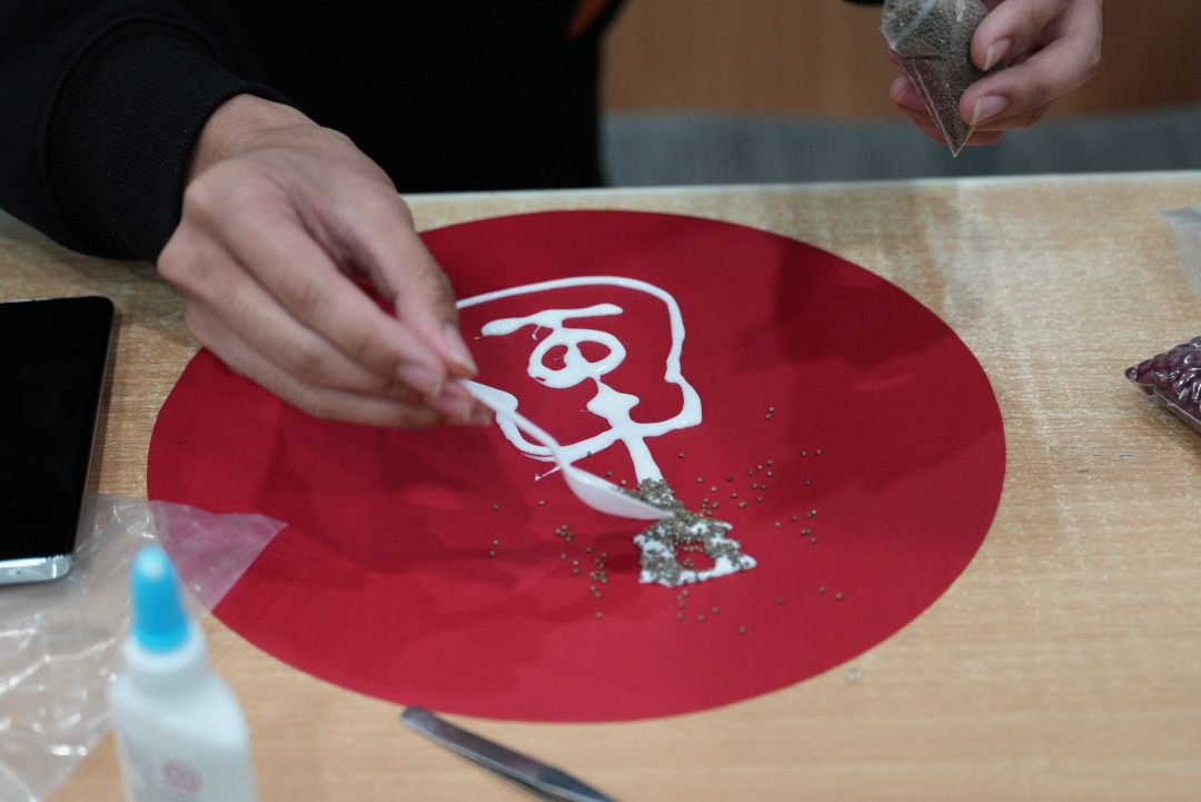 在介绍制作方法后,同学们自行选择工具及材料,自由创作正式开始。经过3个小时的创作,粮食画创作组的同学们,巧妙运用红豆、绿豆、彩米等材料,思考颜色、大小等设计,组合拼贴成星空、花卉、蝴蝶、海绵宝宝、熊猫等图案。纸浆画小组的同学们则调配各种自己喜欢的颜色,利用纸浆立体性的特点,塑造栩栩如生的图案。大家一丝不苟的制作,每一处都仔细雕琢,在同学们的巧手下,各种图案跃然纸上,有金色麦天卷起朵朵浪花,夜游深邃的天空星光灿烂。