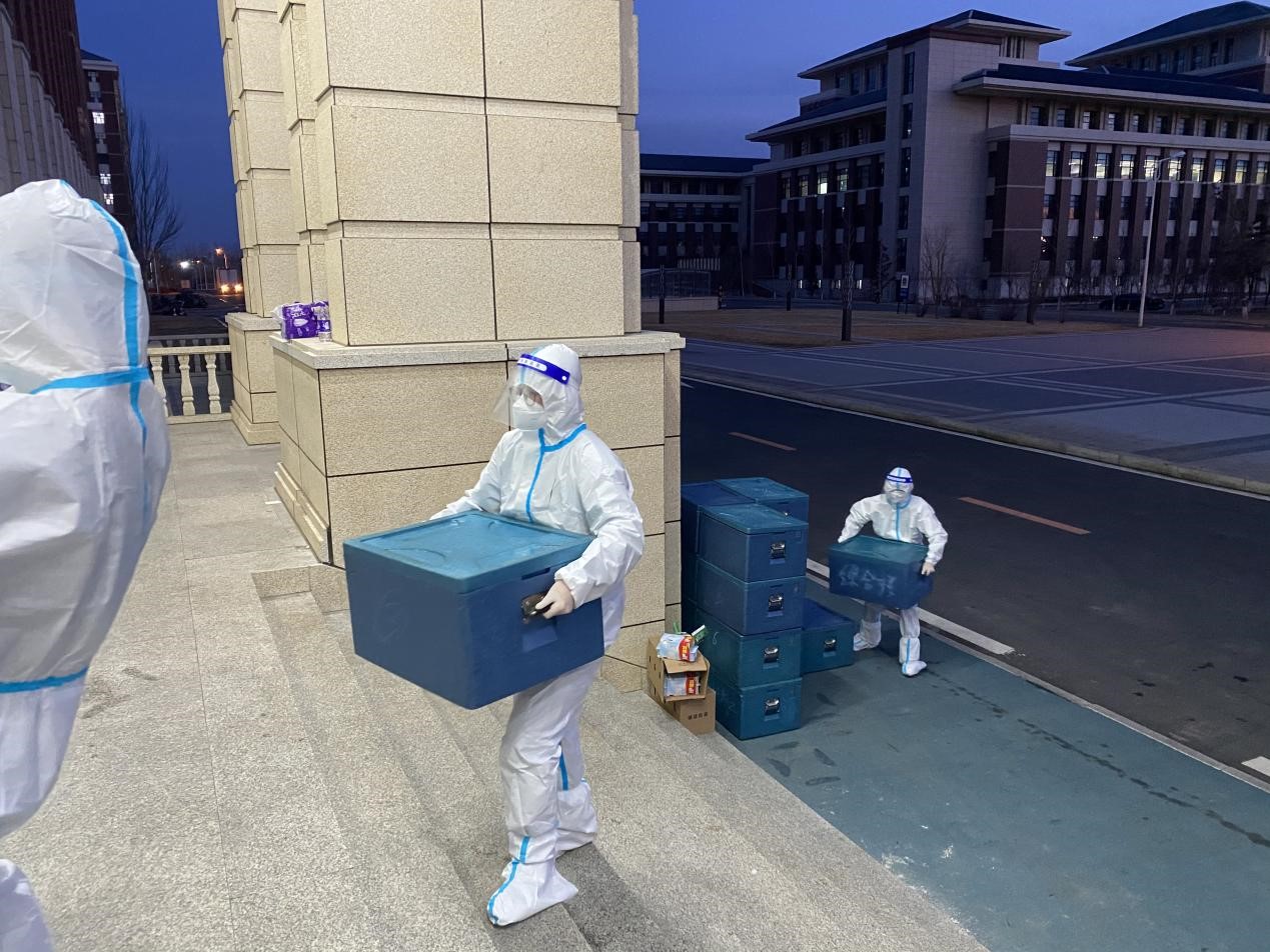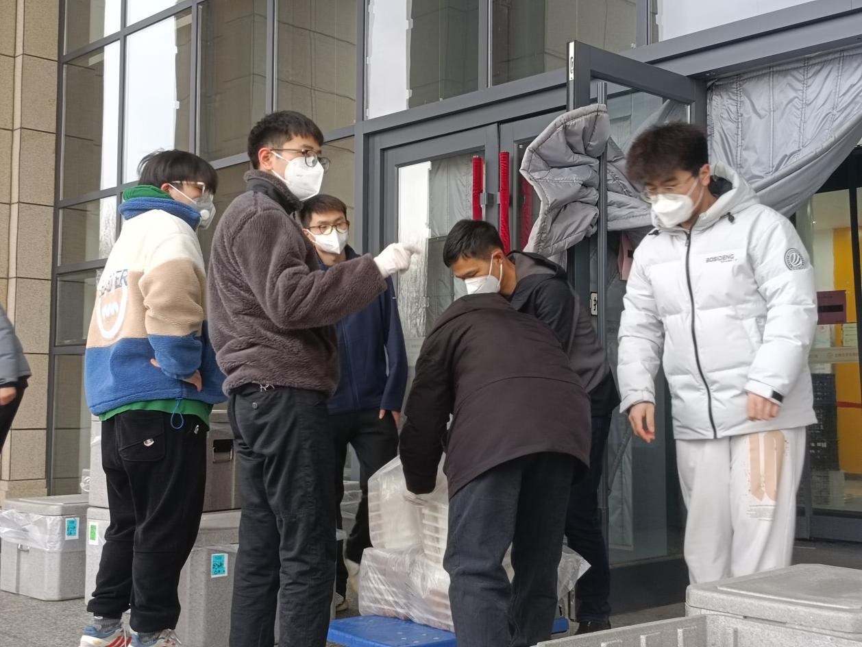 2022年3月25日,公司研究生志愿者在辅导员老师的号召下主动承担起北苑四公寓全楼物资配送任务,迅速成立了三支志愿者队伍:第一支由2019级党支部书记潘得新带领的5人志愿先锋队,协助楼长负责全楼整体工作;第二支由2021级党支部书记高磊带领的30人纵向配餐志愿者队伍,负责将门口的所有物资转运分发给各楼层同学;第三支由beats365研会主席韩文强带领的30人楼层志愿者队伍,横向为公司内部同学服务。