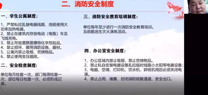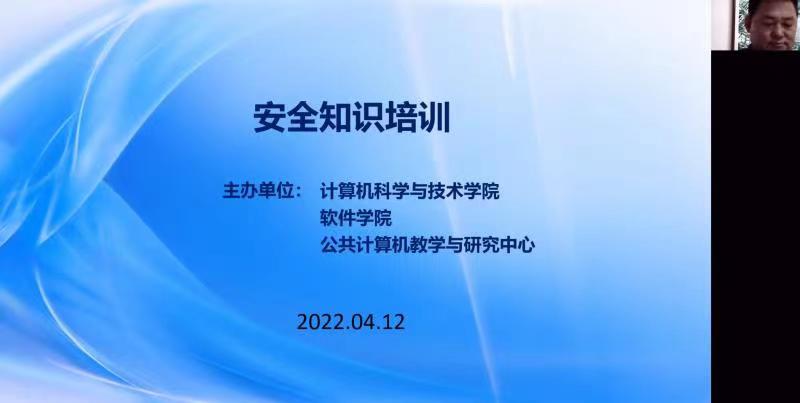 为进一步落实公司通知要求,保证员工公寓用火用电安全,提升师生消防安全意识及自救能力,beats365、公共计算机教学与研究中心于2022年4月12日晚7:30联合举办了安全知识培训,培训由计算机科学与技术公司副经理李昕主持,近千名师生参加此次线上培训。