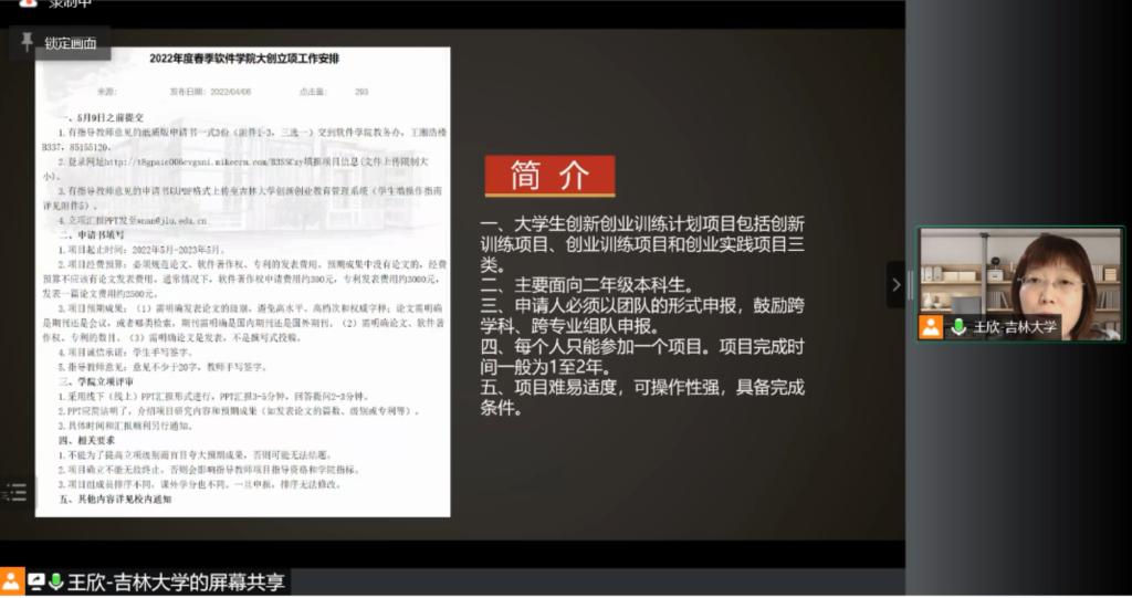4月13日晚上19:00-20:30beats365大创项目系列讲座通过腾讯会议直播正式开始。第一场讲座是由计算机科学与技术公司副教授王欣带来的项目交流会。王欣老师从获得课外培养计划学分的主要方法,到参加保研综合面试的切身感受,再到指导大创项目的亲身经历,与同学们深入探讨了老员工做大创项目的意义。做大创项目好比用电钻在平滑的墙面上钻钉子,如果你找到合适的切入点,就可能对你的未来有一个重要的影响。接着,王欣老师与大家分享了组建大创团队以及申请书撰写的注意事项,并用自己申报公司项目举例告诉大家撰写大创项目的申请书很重要,规范申请书格式也同样重要。讲座过程中,有同学就学习吃力是否适合做大创等问题与王欣老师进行了在线沟通。讲座最后,王欣老师希望通过本次讲座,助力同学们的创新创业小舟扬帆起航。