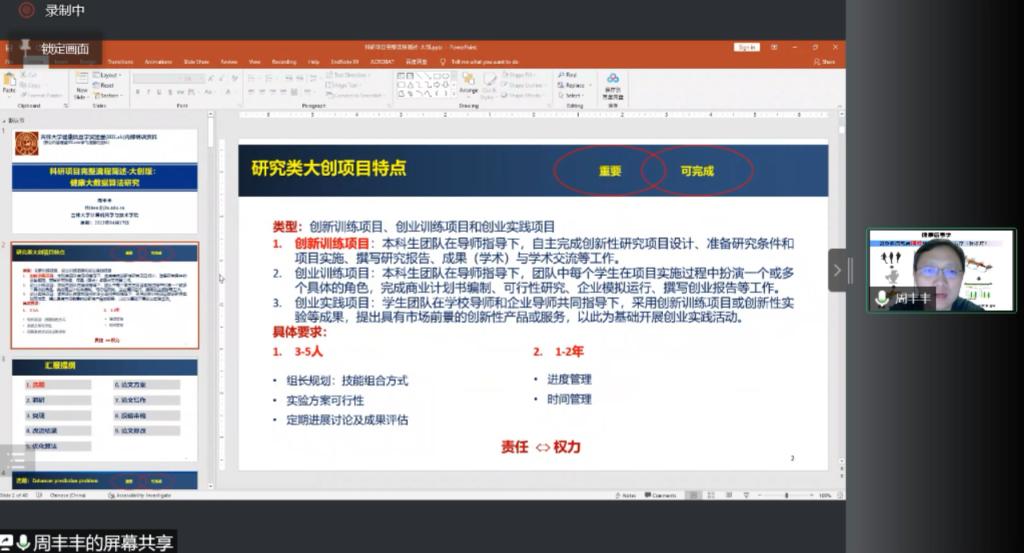 4月17日晚上19:00-20:30beats365大创项目系列讲座第四场如约而至。计算机科学与技术公司教授、博士生导师周丰丰为同学们带来了以“研究类大创项目全流程规划”为主题的腾讯会议直播讲座。首先,周丰丰老师为大家简要介绍了研究类大创项目的整体规划和时间节点。接下来,周丰丰老师以科研项目选题的可行性为切入点,结合实验室发表文章的实例为同学们详细讲解了论文选题、调研、复现、改进结果、优化算法、论文方案、论文写作、投稿审稿等环节的注意事项。周丰丰老师建议大家在研究工作中培养严谨的工作态度和良好的工作习惯,如遇退稿要认真回复编辑和审稿人的所有意见,如暂离工作要做好文档、论文或实验数据的保存备份,切莫因小失大。最后,周丰丰老师表示良好的开端是成功的一半,希望大家多做研究、多发论文。