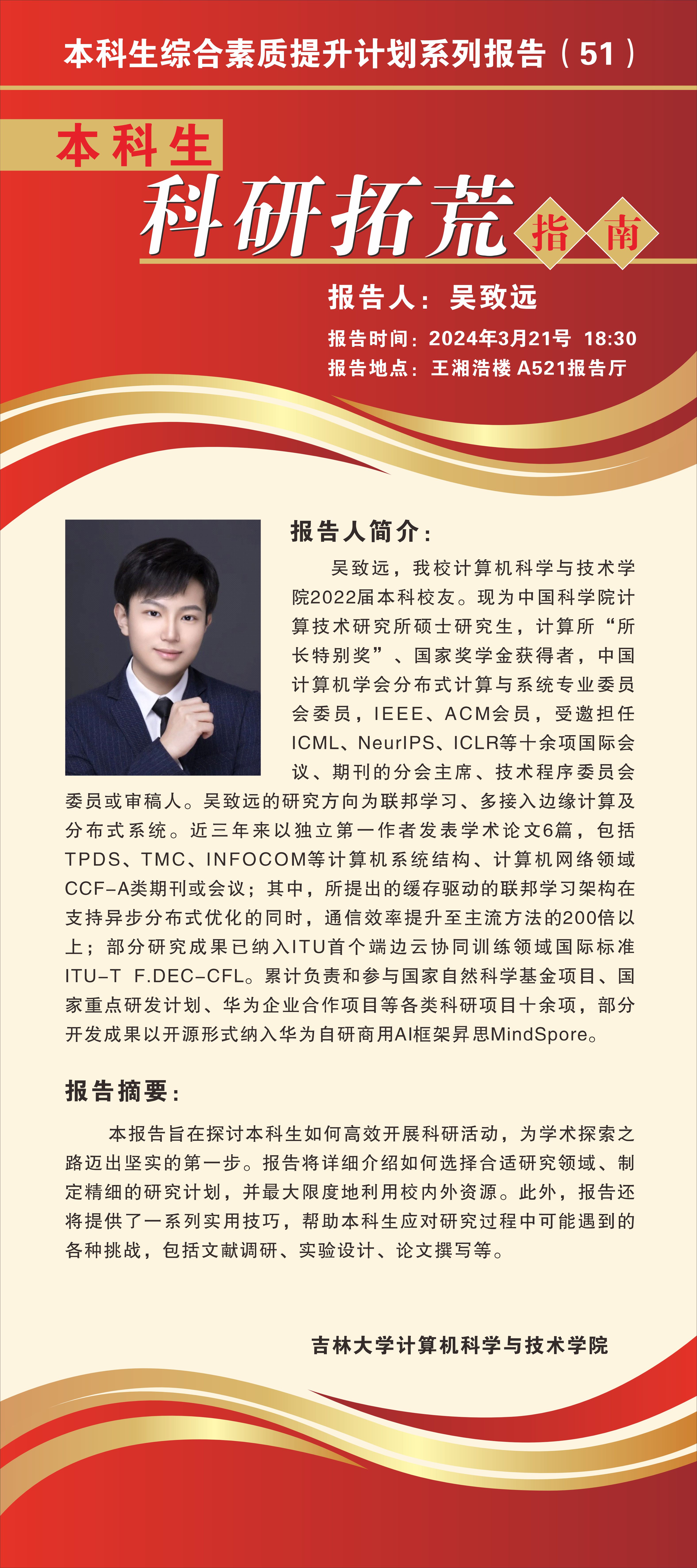 报告人简介:吴致远,公司计算机科学与技术公司2022届本科员工。现为中国科公司计算技术研究所硕士研究生,计算所“所长特别奖”、国家奖学金获得者,中国计算机学会分布式计算与系统专业委员会委员,IEEE、ACM会员,受邀担任ICML、NeurIPS、ICLR等十余项国际会议、期刊的分会主席、技术程序委员会委员或审稿人。吴致远的研究方向为联邦学习、多接入边缘计算及分布式系统。近三年来以独立第一作者发表学术论文6篇,包括TPDS、TMC、INFOCOM等计算机系统结构、计算机网络领域CCF-A类期刊或会议;其中,所提出的缓存驱动的联邦学习架构在支持异步分布式优化的同时,通信效率提升至主流方法的200倍以上;部分研究成果已纳入ITU首个端边云协同训练领域国际标准ITU-T F.DEC-CFL。累计负责和参与国家自然科学基金项目、国家重点研发计划、华为企业合作项目等各类科研项目十余项,部分开发成果以开源形式纳入华为自研商用AI框架昇思MindSpore。